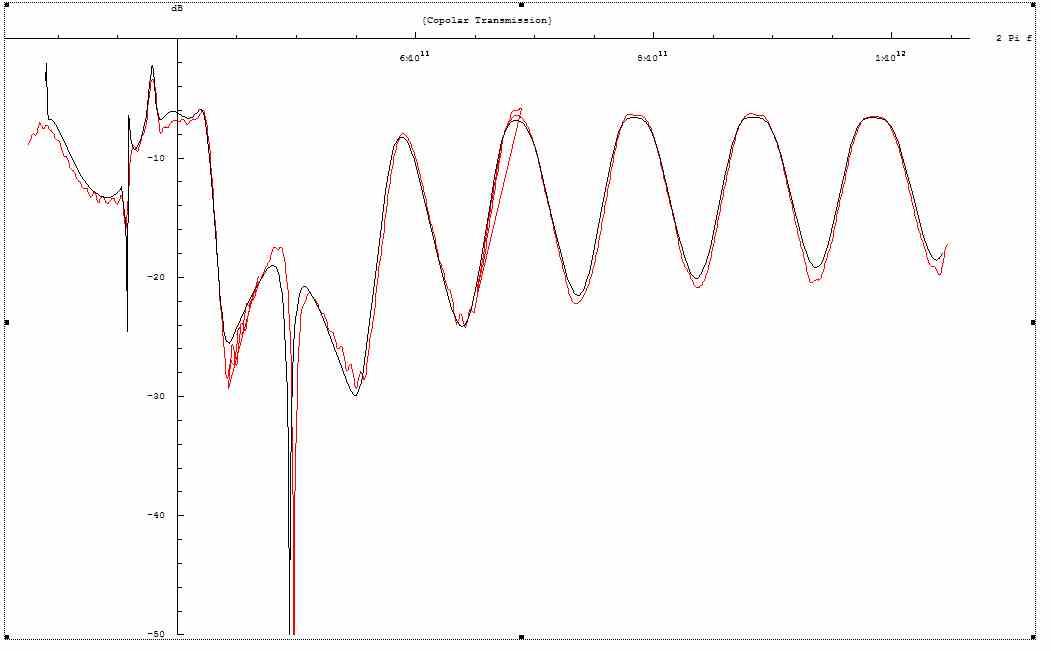 The matching of the model to experimental results is strikingly good, as this plot of the model in black and the measured co-polar transmission in red shows